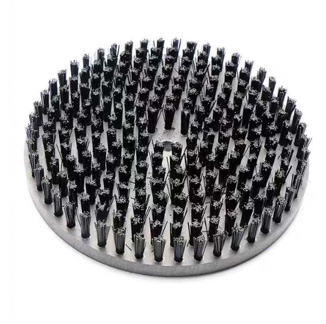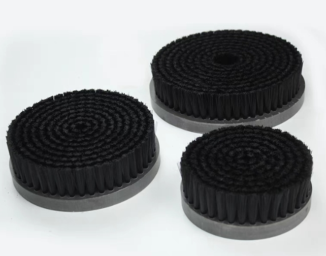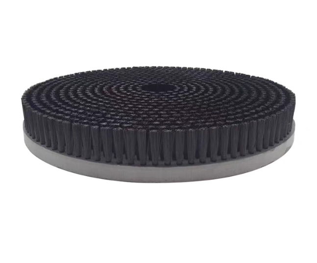 Los cepillos de disco de cerdas de nylon industriales son un tipo común de cepillo industrial. Su estructura central consiste en cerdas de nylon agrupadas (generalmente en mechones) aseguradas a una base circular de metal o plástico. La base generalmente presenta un orificio axial central (como un orificio en D o un orificio roscado) para una fácil fijación a un eje en un motor, máquina herramienta o equipo automatizado.